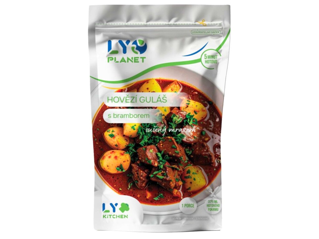 Hovězí guláš s bramborem. Dehydratovaný výrobek. Sušeno mrazem. Lyofilizované potraviny nabízejí dlouhou trvanlivost, nízkou hmotnost a zachování všech živin i chuti.