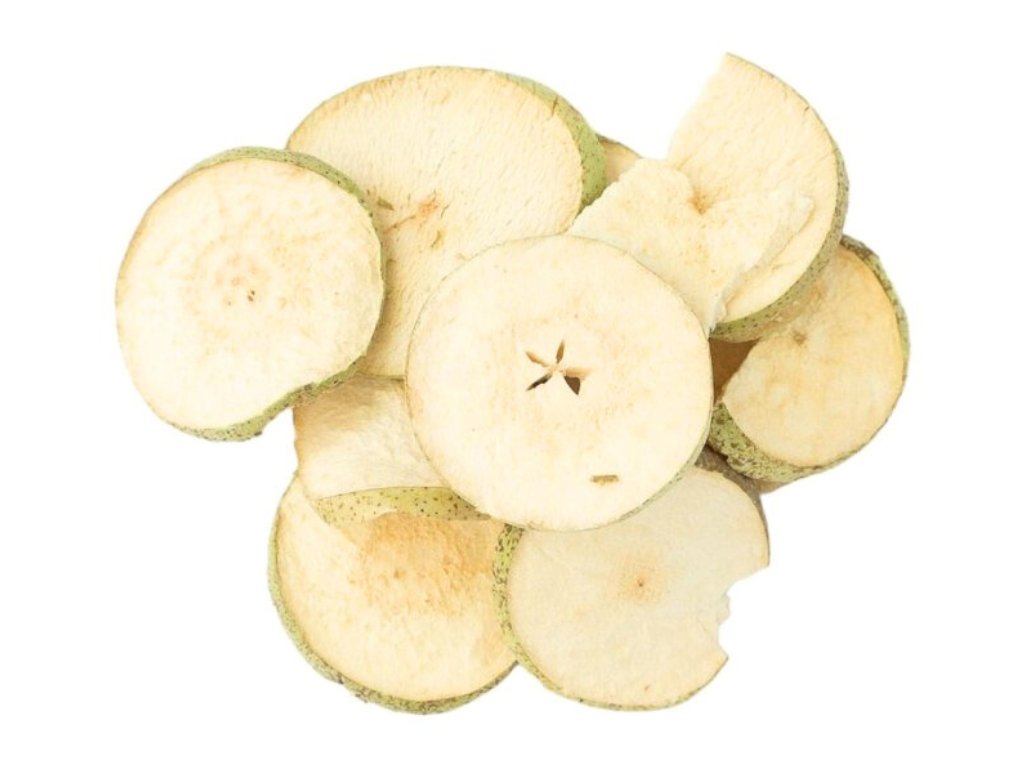 Hruška. Dehydratovaný výrobek. Sušeno mrazem. Lyofilizované potraviny nabízejí dlouhou trvanlivost, nízkou hmotnost a zachování všech živin i chuti.