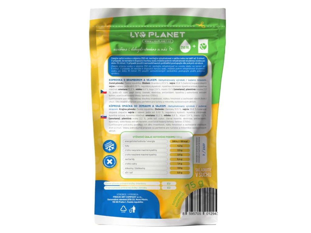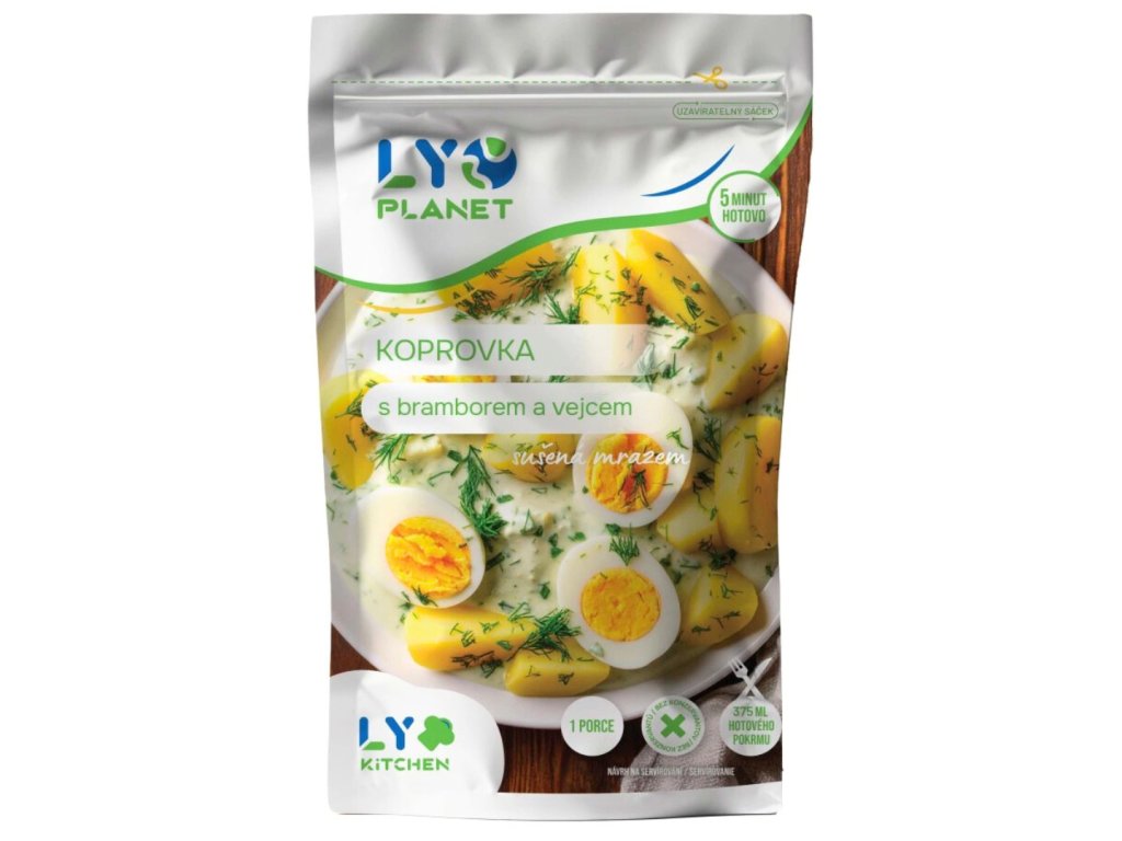 Koprovka s bramborem a vejcem. Dehydratovaný výrobek. Sušeno mrazem. Lyofilizované potraviny nabízejí dlouhou trvanlivost, nízkou hmotnost a zachování všech živin i chuti. Díky snadné přípravě jsou perfektní pro turisty a milovníky outdoorových aktivit.