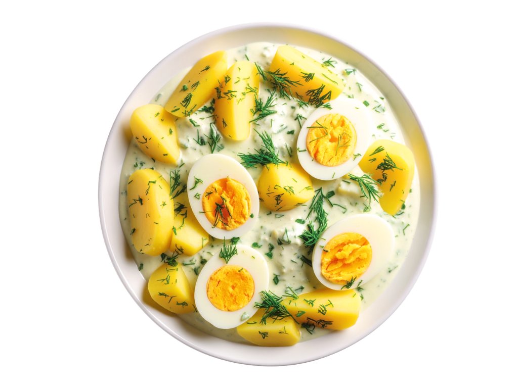 Složení: Brambory 51,5 %, vejce 20,6 % (vařená loupaná slepičí vejce v nálevu, jedlá sůl 0,53 %, regulátory kyselosti: kyselina citronová, kyselina octová, kyselina mléčná), smetana 10,3 %, mléko 8,8 %, kopr 2,9 %, máslo 1,5 % (smetana),pšeničná mouka 2,2%, jedlá sůl, cukr, pepř černý, česnek, dextróza, antioxidant: kyselina L-askorbová, extrakt koření, ocet (ocet kvasný lihový, barvivo: E150