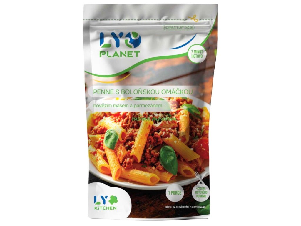 Těstoviny Penne s boloňskou omáčkou, hovězím masem a parmezánem. Dehydratovaný výrobek. Sušeno mrazem. Lyofilizované potraviny nabízejí dlouhou trvanlivost, nízkou hmotnost a zachování všech živin i chuti.