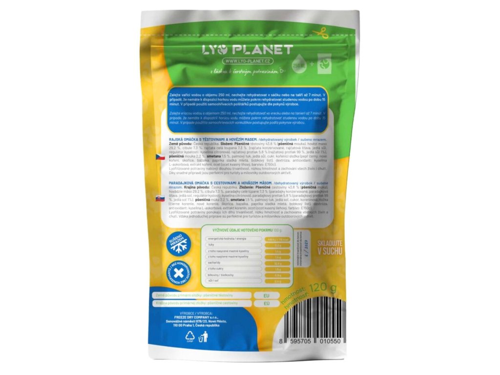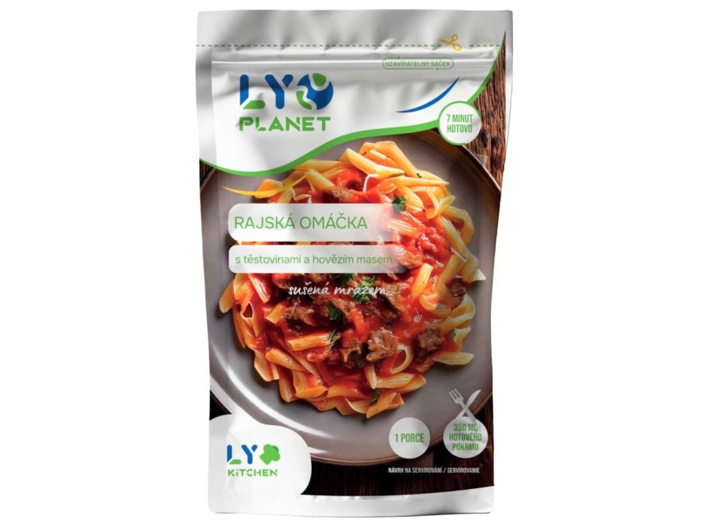 Rajská omáčka s těstovinami a hovězím masem. Dehydratovaný výrobek. Sušeno mrazem. Lyofilizované potraviny nabízejí dlouhou trvanlivost, nízkou hmotnost a zachování všech živin i chuti.