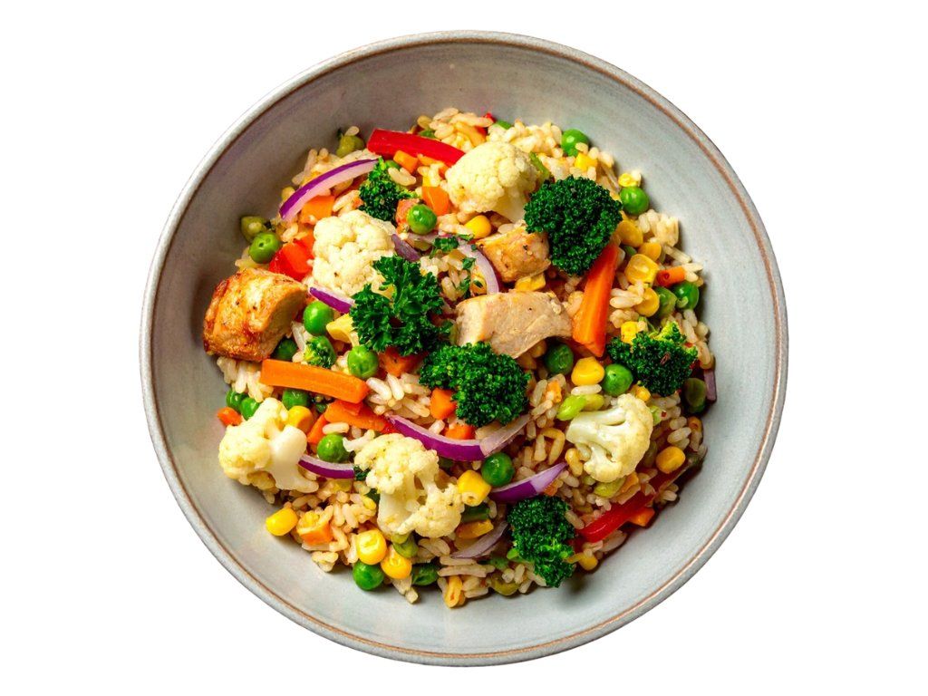 Složení: jasmínová rýže: 48,3%, kuřecí prsa 19,3 %, květák 8%, brokolice 5,8%, kukuřice cukrová zrno 4 %, cibule červená 4 %, petržel 3,2%, hrášek 3,2%, sójová omáčka (sójové boby, pšenice, jedlá sůl), cukr, extrakt koření, dextróza, antioxidant : kyselina L-askorbová, kořenící složka (kurkuma, pepř černý, paprika sladká mletá, petržel nať), česnek, rajčatový protlak 2,6% ( pasterizovaný zahuštěný rajčatový protlak 99,9% jedlá sůl 0,1%), ocet kvasný lihový, jedlá sůl